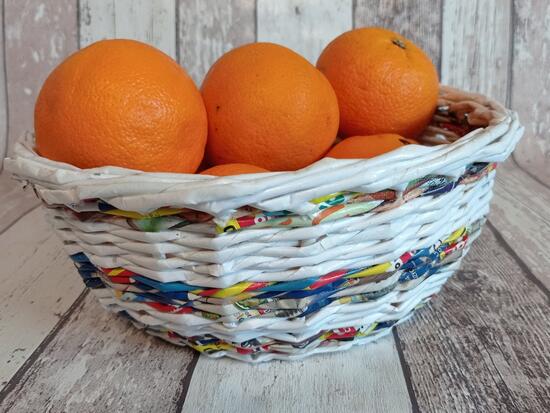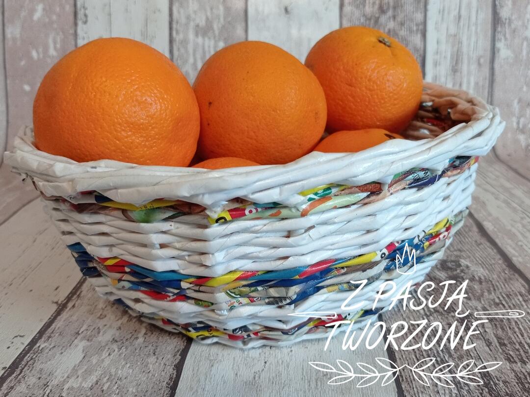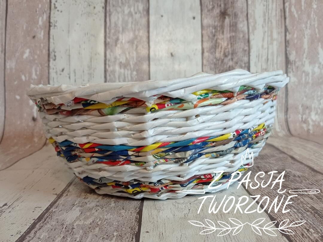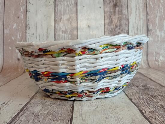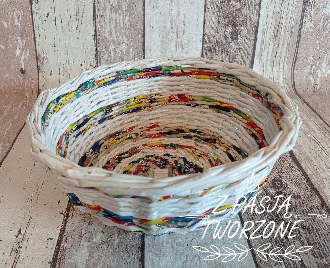 Misa z papierowej wikliny. Pasy biało-kolorowe, poziome. Wykorzystane kolorowe gazety i papier ksero. Wysokość 11 cm, szerokość 26 cm, szerokość dna 17 cm.Zabezpieczona lakierem akrylowym