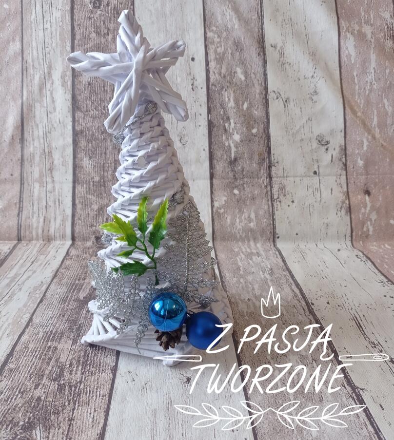 Biała choinka wypleciona z białego papieru ksero ozdobiona w kolorach niebieskim i srebrnym