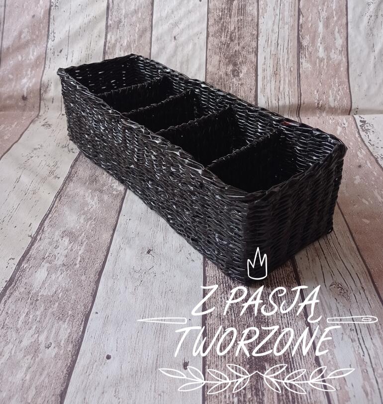 Koszyk wyplaciony z zafarbowanych ulotek sklepowych