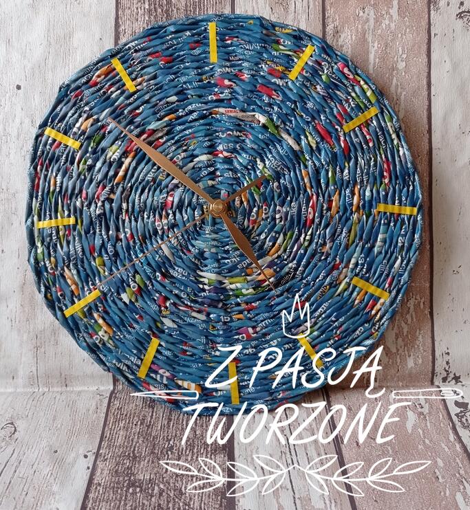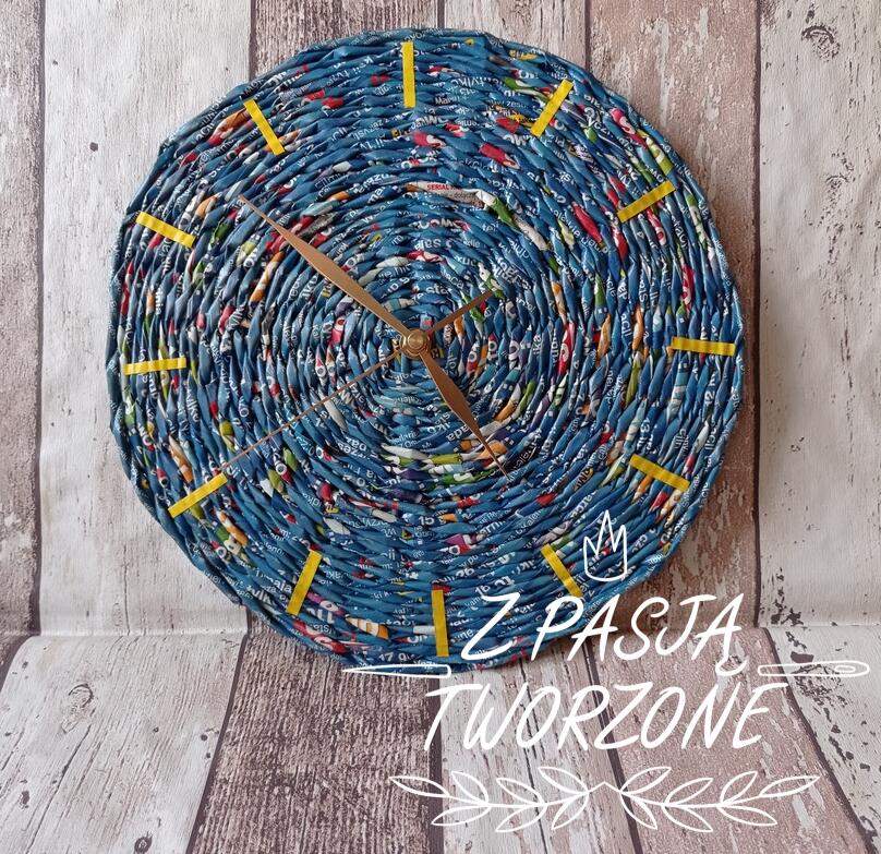 Wypleciony z dobranych kolorystycznie niebieskich rurek z progamów telewizyjnych zegar