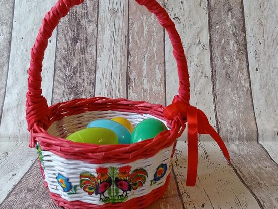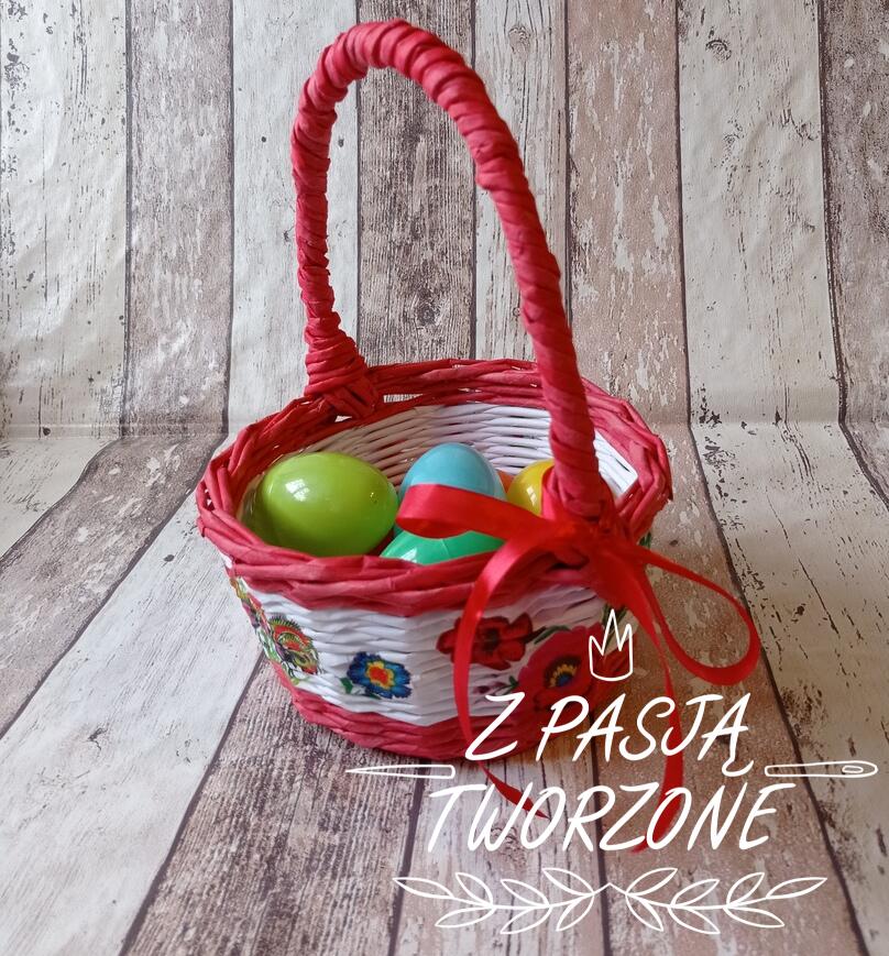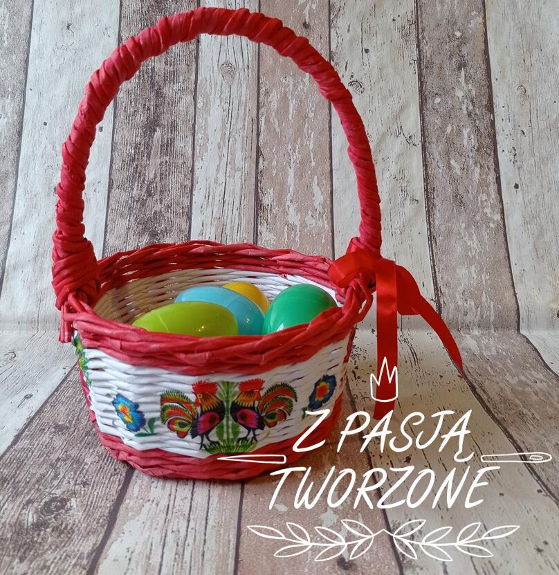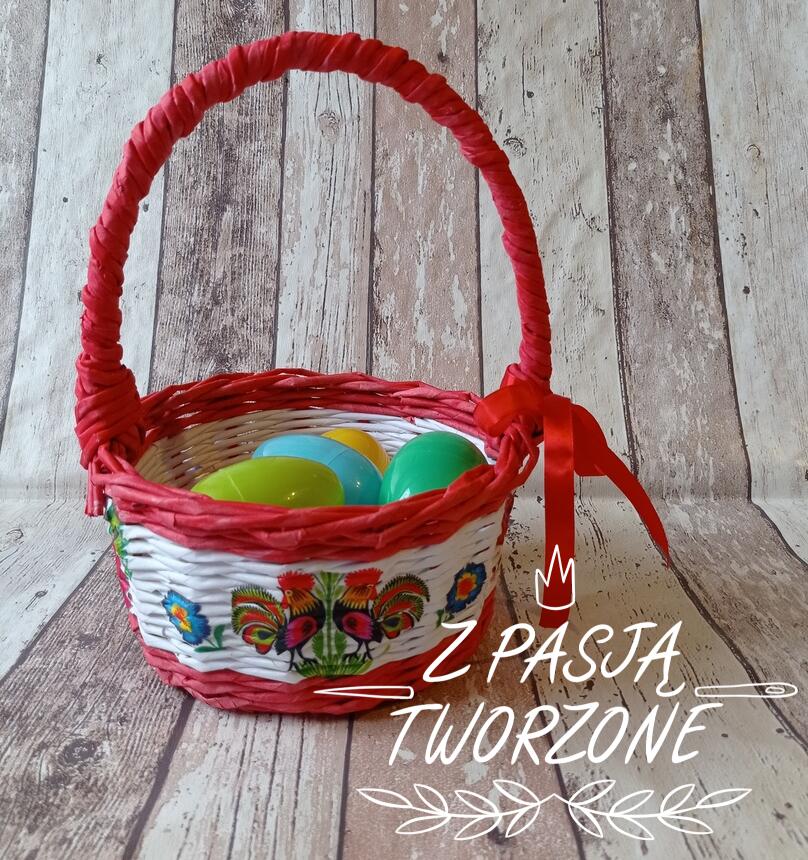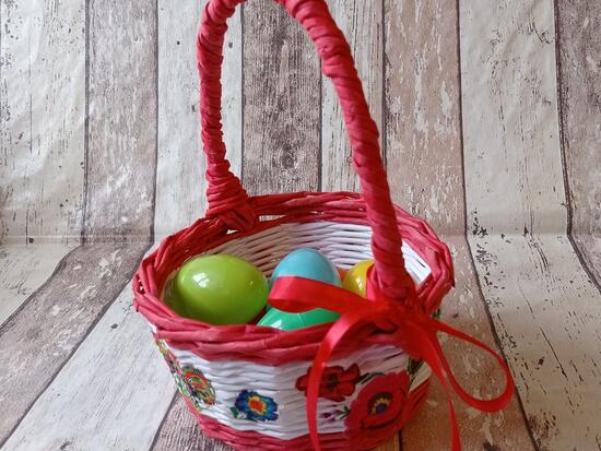 Wyplecionyz papieru ksero i zafarbowanych gazet koszyczek. Ozdobiony techniką decoupage.