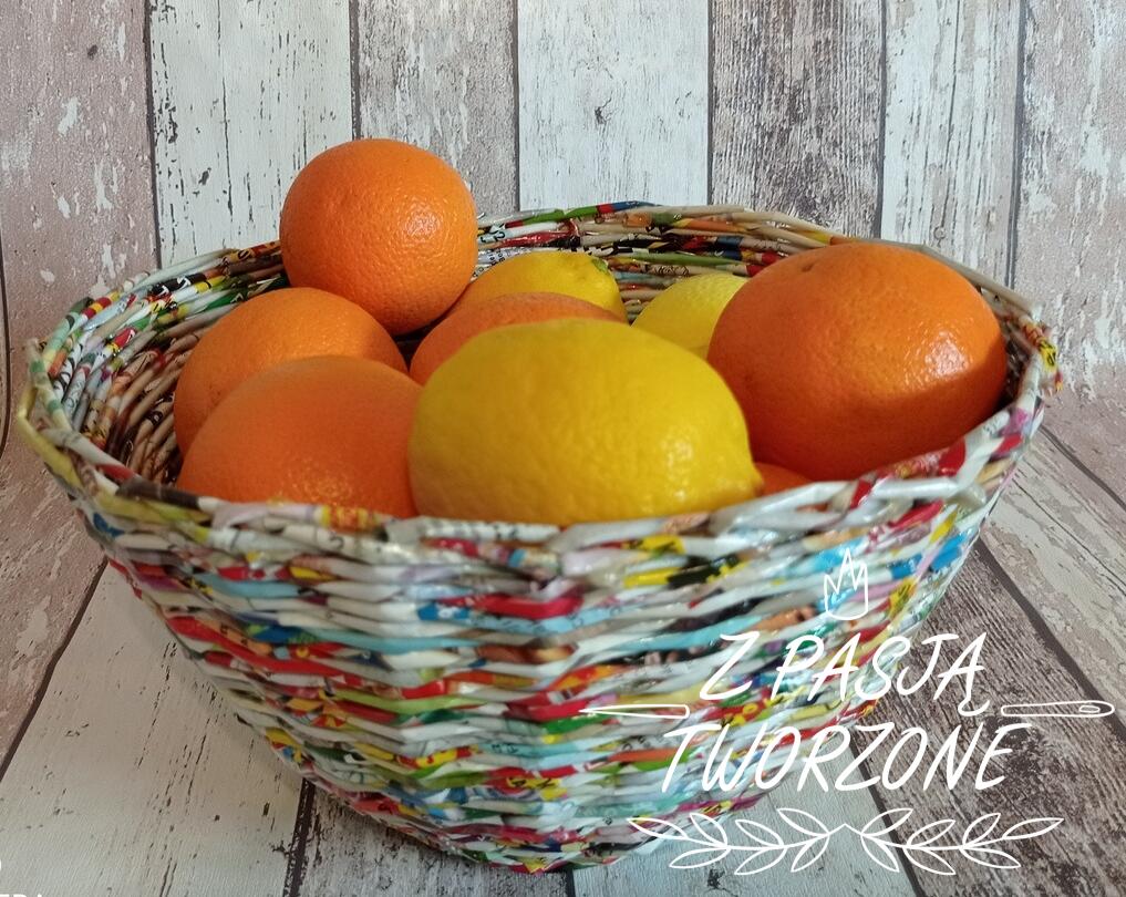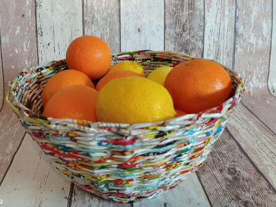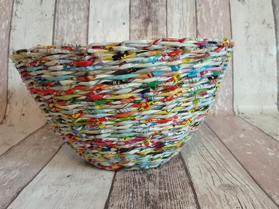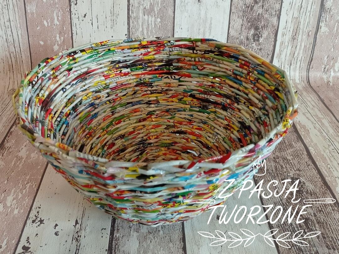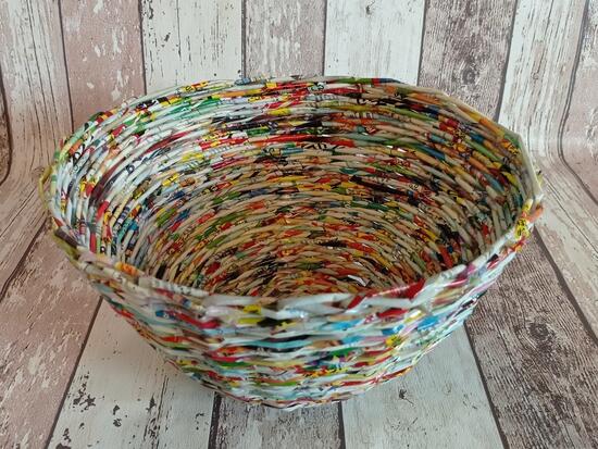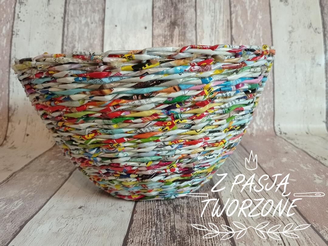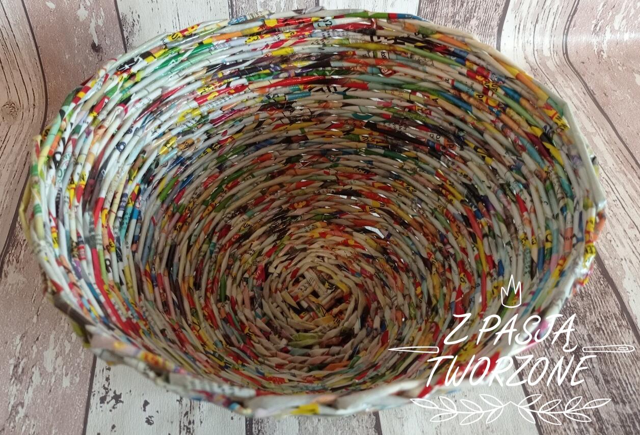 Duża misa z papierowej wikliny, wykonana z ulotek sklepowych. Jej wysokość to 16 cm. Szerokość misy to 11 cm przy dnie, zaś w najszerszym miejscu 29 cm. Utrwalona lakierem akrylowym.