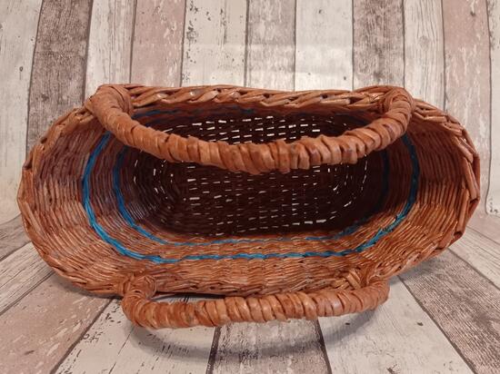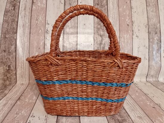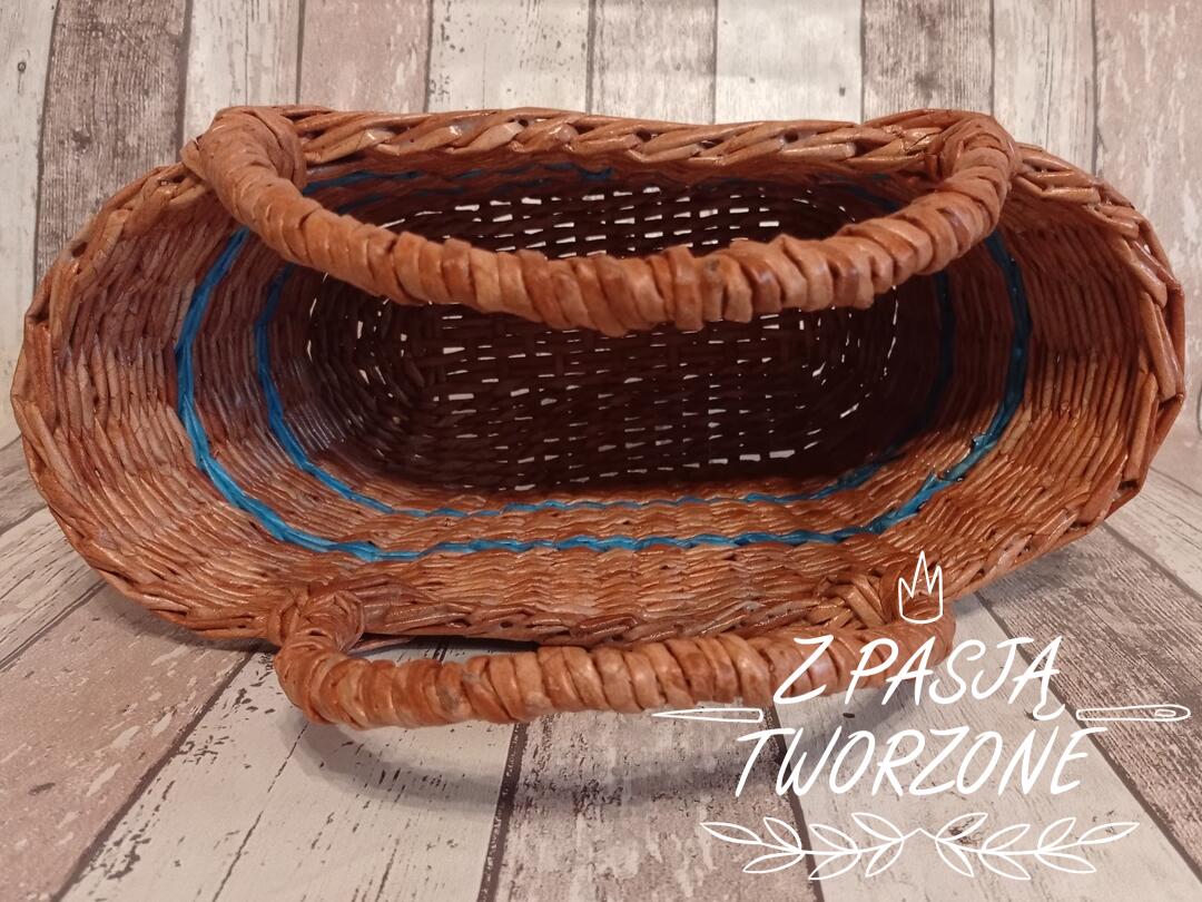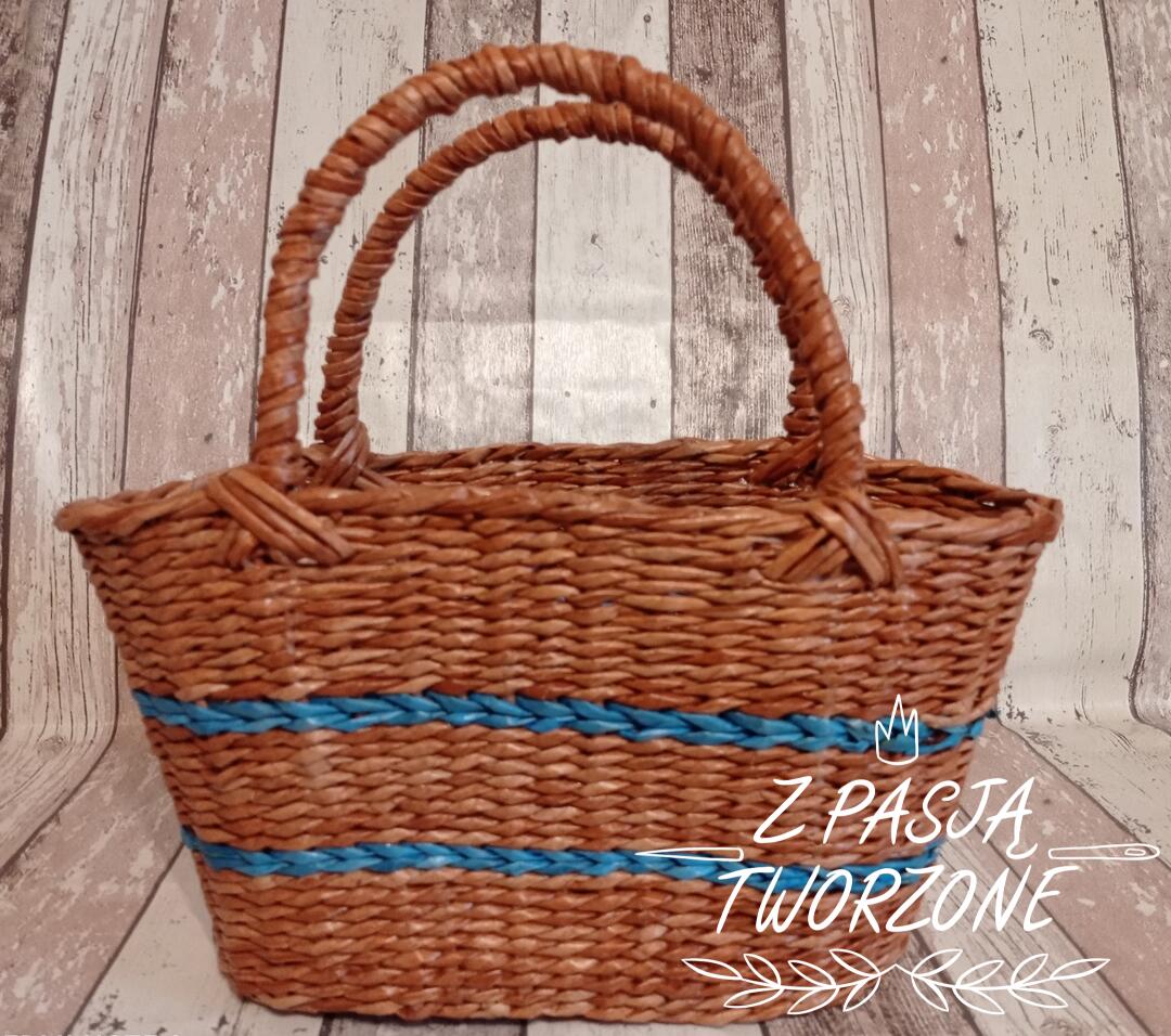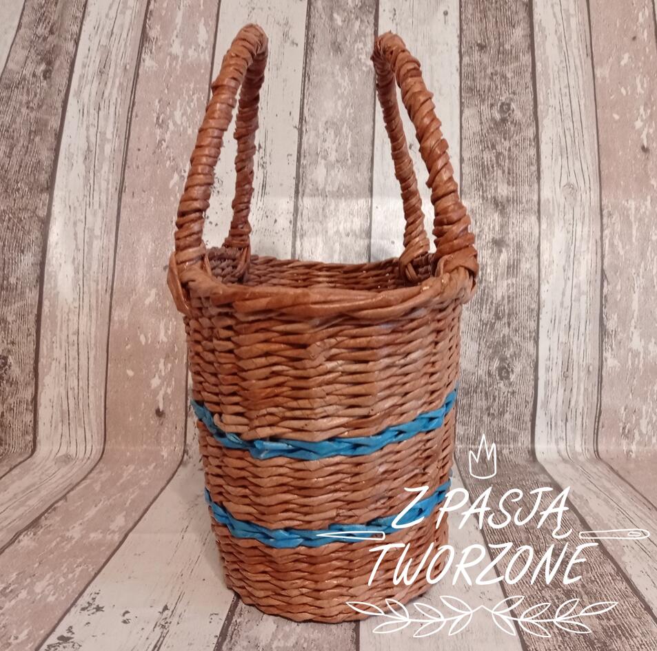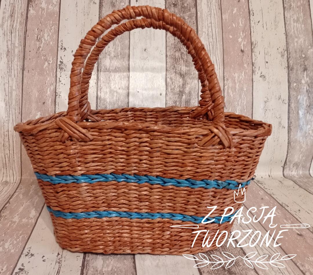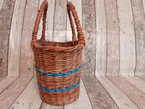 Koszyk -torebka z papierowej wikliny. Upleciony z gazet codziennych, zafarbowanych. Koszyk w kolorze jasnobrązowym z pasami niebieskimi. Uszy koszyczka wzmocnione drutem. Koszyk może być używany jako gazetnik, koszyk na przydasie lub koszyk - torebka na lato. Zabezpieczony przed wilgocią i usztywniony przy użyciu lakieru akrylowego. (Produkt dostępny)