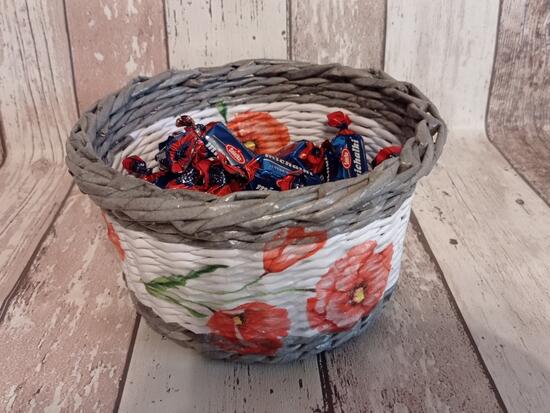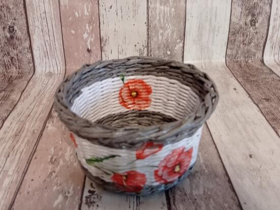 Koszyczek o wysokości 11 cm. Szerokość koszyczka to 20 cm. Szerokość dna to 16 cm. Ozdobiony metodą docoupage. Utrwalony lakierem akrylowym.