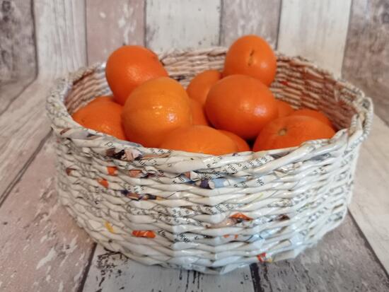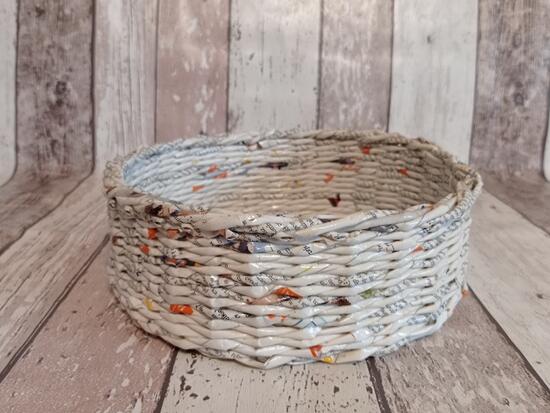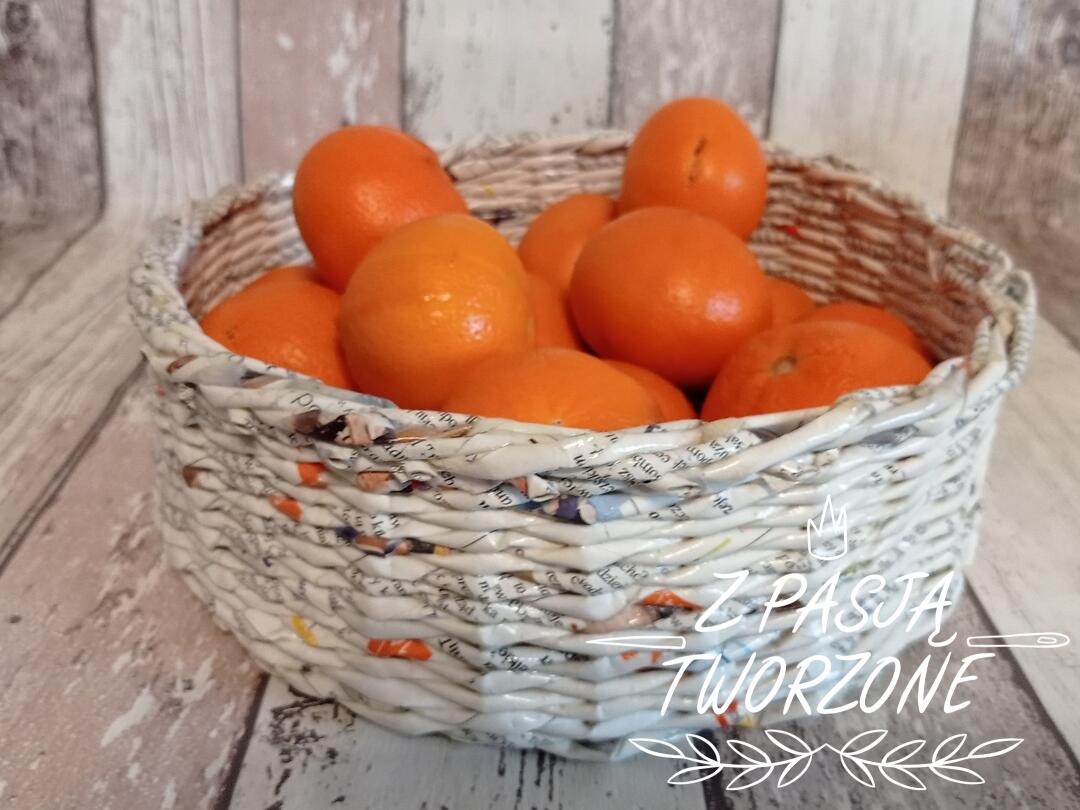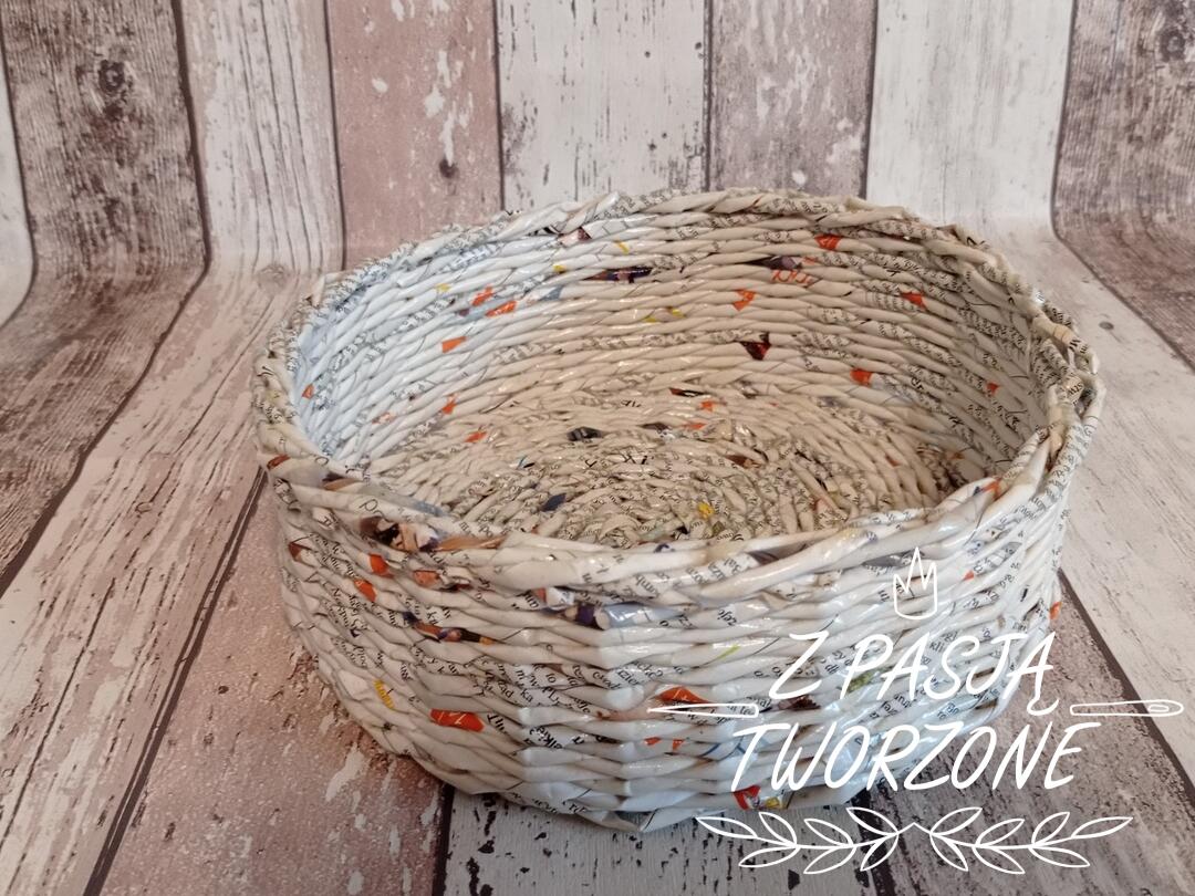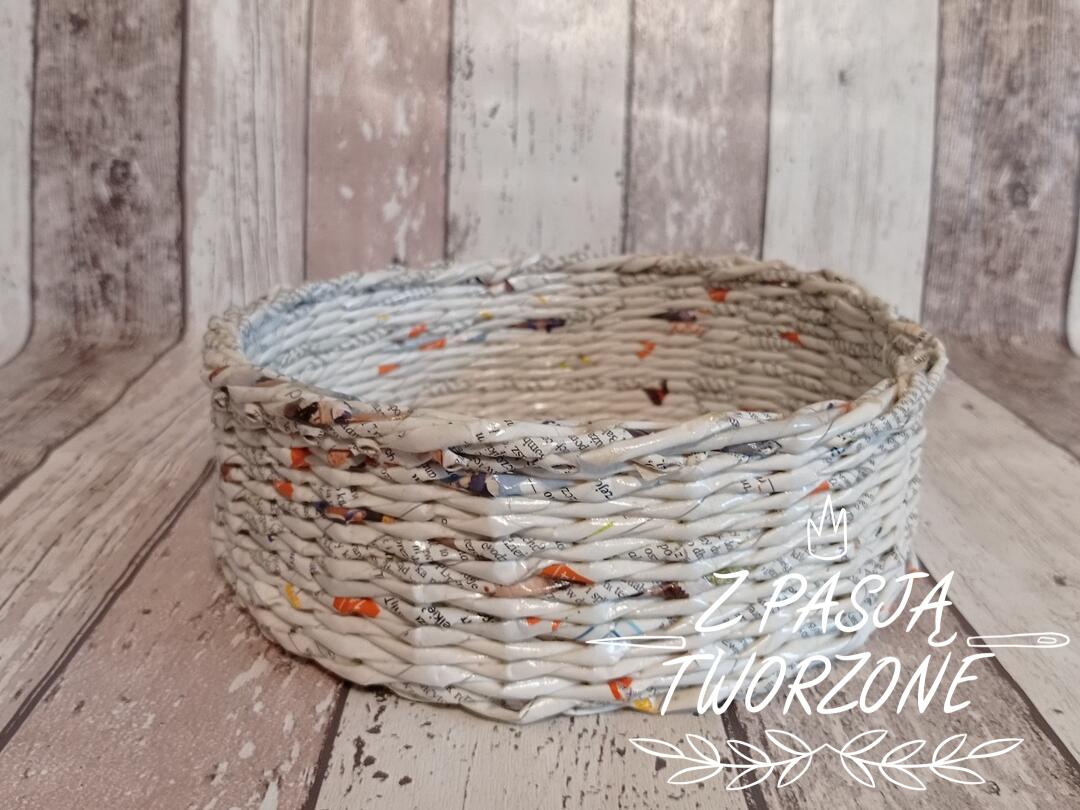 Koszyczek z papierowej wikliny. Szerokość koszyczka 24 cm .Wysokość koszyka 8 cm. Białe gazetki z druczkiem i plamkami pomarańczu. Zabezpieczony lakierem akrylowym