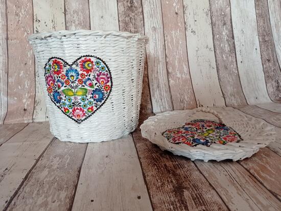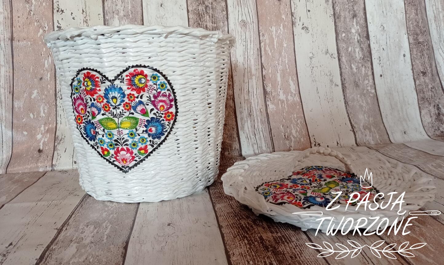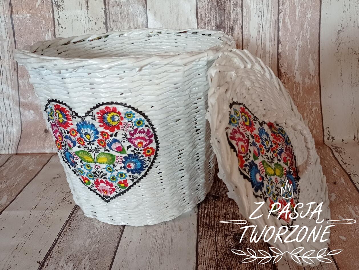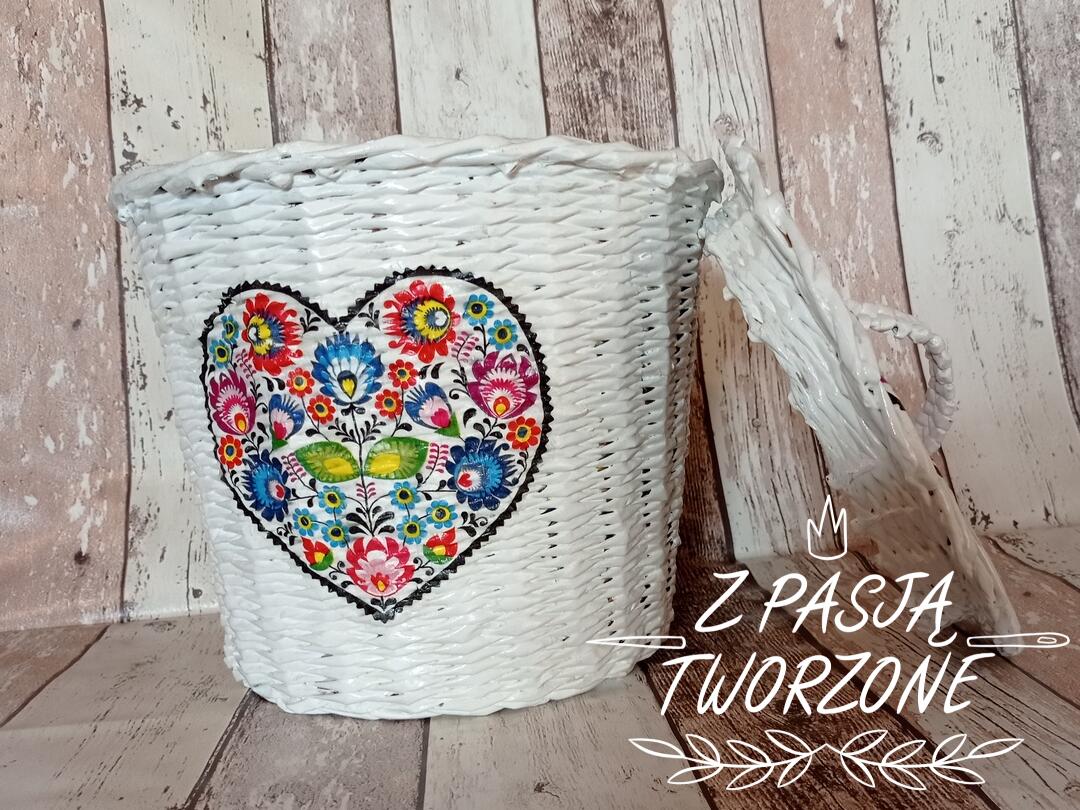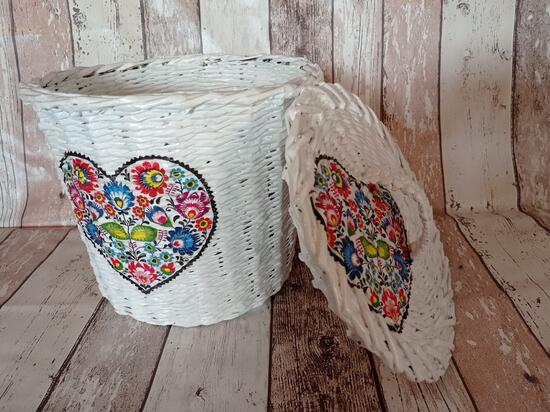 Kosz z gazety codziennej. Malowany farbą biała na wyplecionym, gotowym wyrobie. Ozdobiony sercem w stylu etno. Dekoracja wykonana metodą decoupage. Utrwalony i usztywniony lakierem. Wymiary koszyka to szerokość 21 cm dno i 27,5 cm w najszerszym miejscu. Wysokość koszyka wynosi ok. 29 cm.