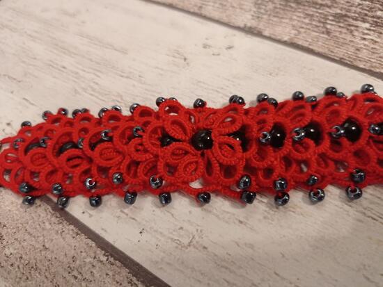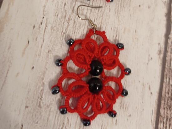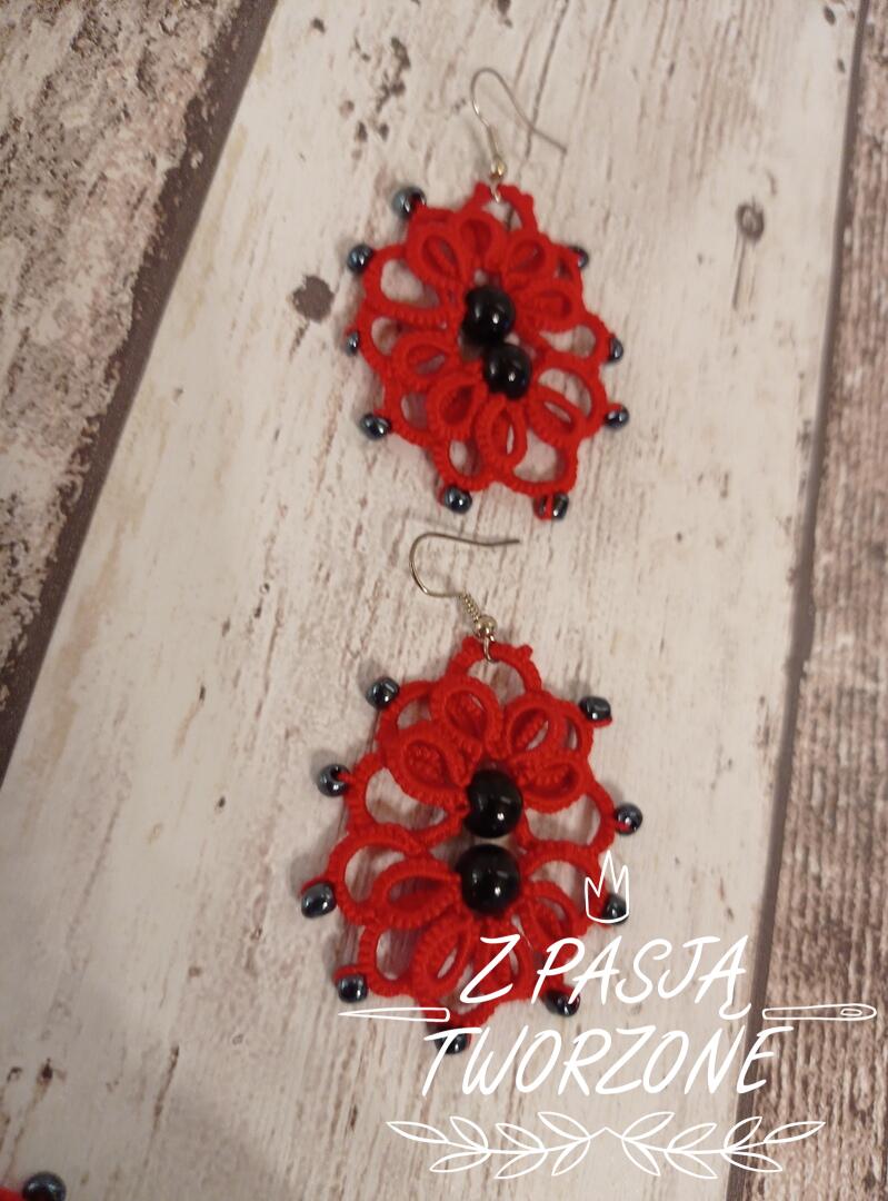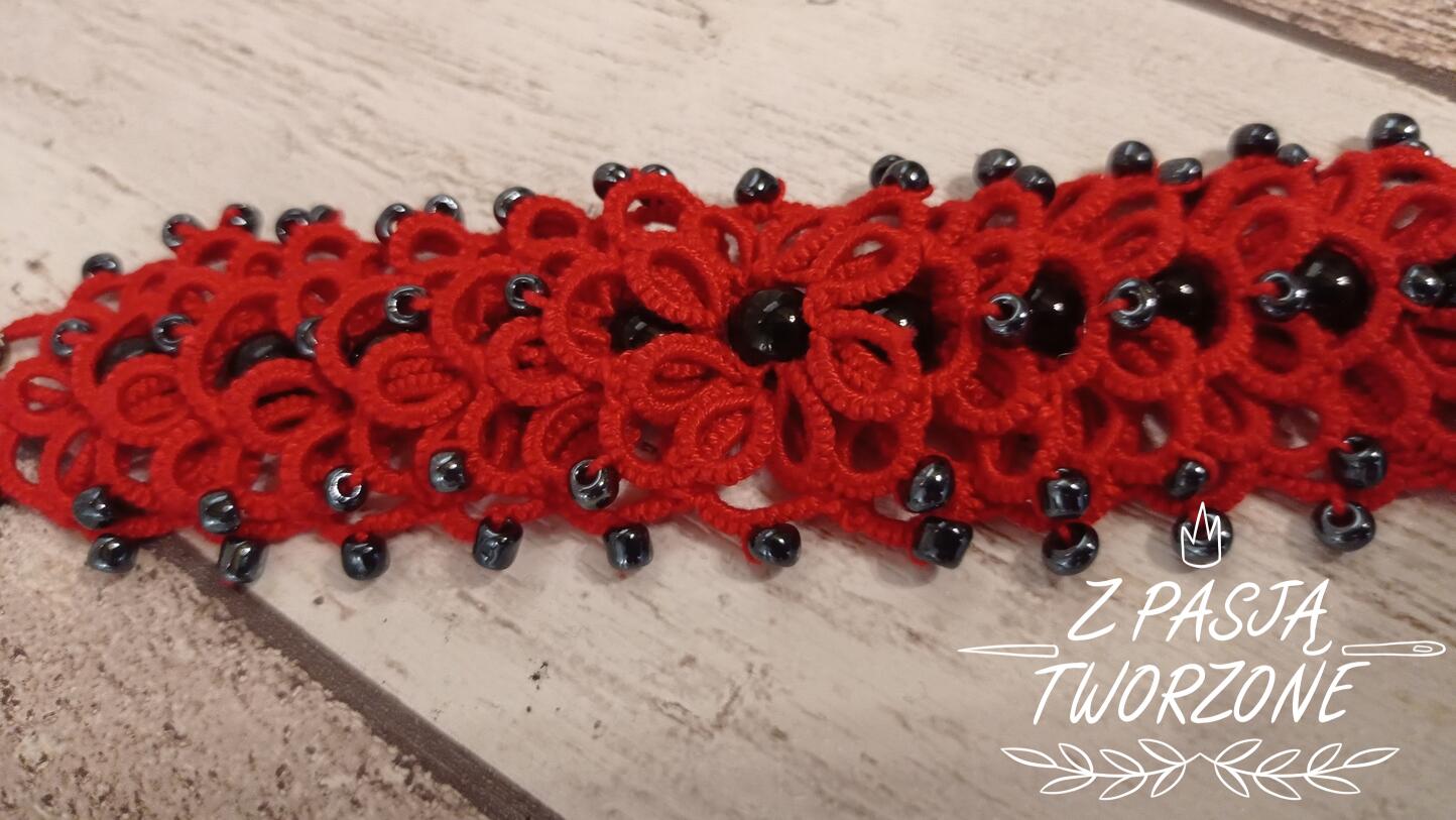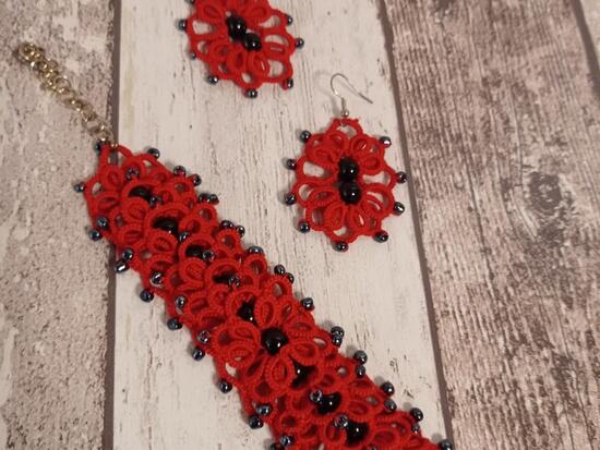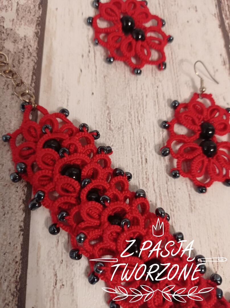 czerwony "grubasek" - bransoletka i kolczyki frywolitkowe