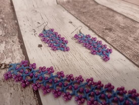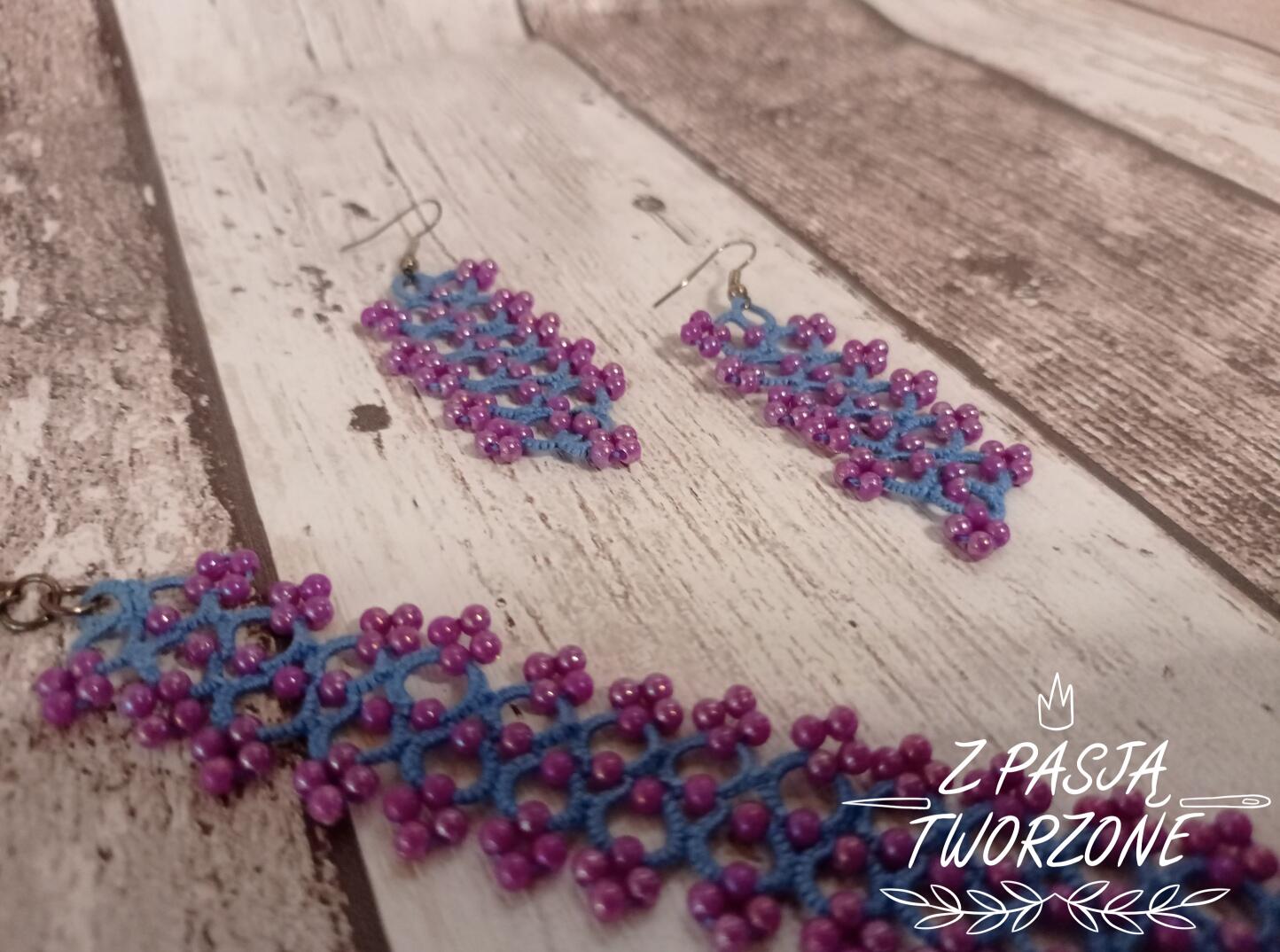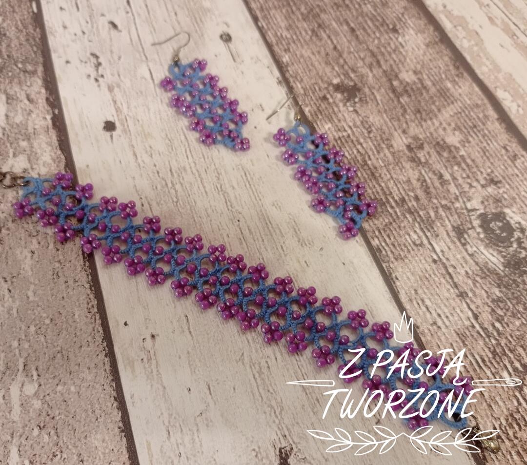 bransoletka i kolczyki niebieskie z fioletowymi koralikami