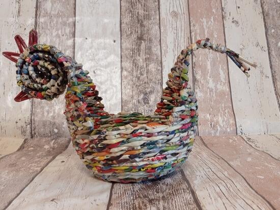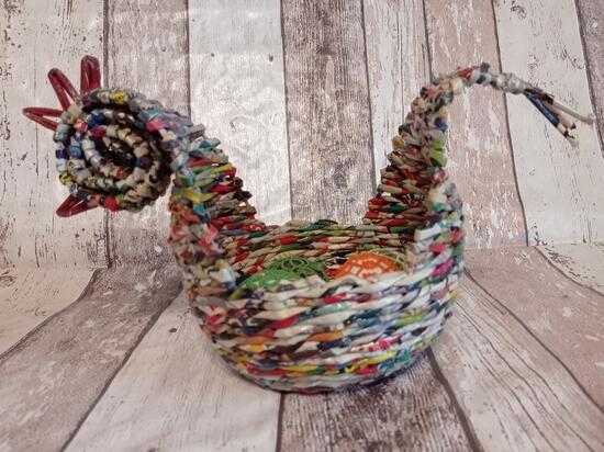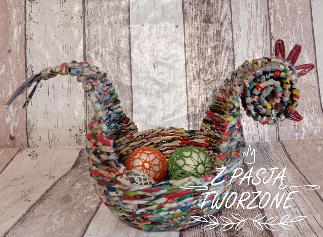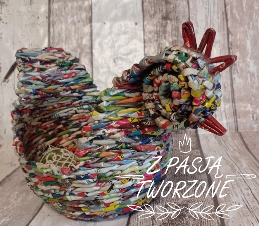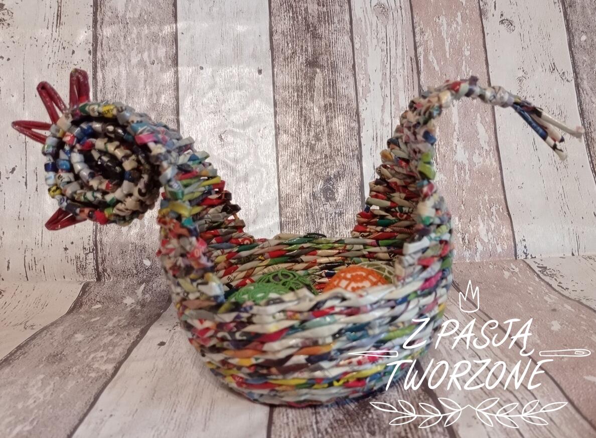 Mały koszyczek w kształcie kurki. Wykonany z kolorowych ulotek. Koszyczek o szerokości dna 10 cm i 32 cm w najszerszym miejscu. Wysokość koszyczka 7 cm, w najwyższym miejscu 19 cm. Koszyczek utrwalony lakierem akrylowym.