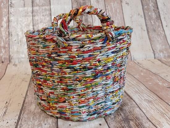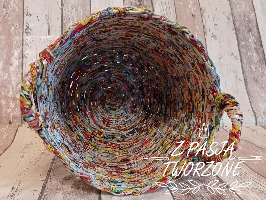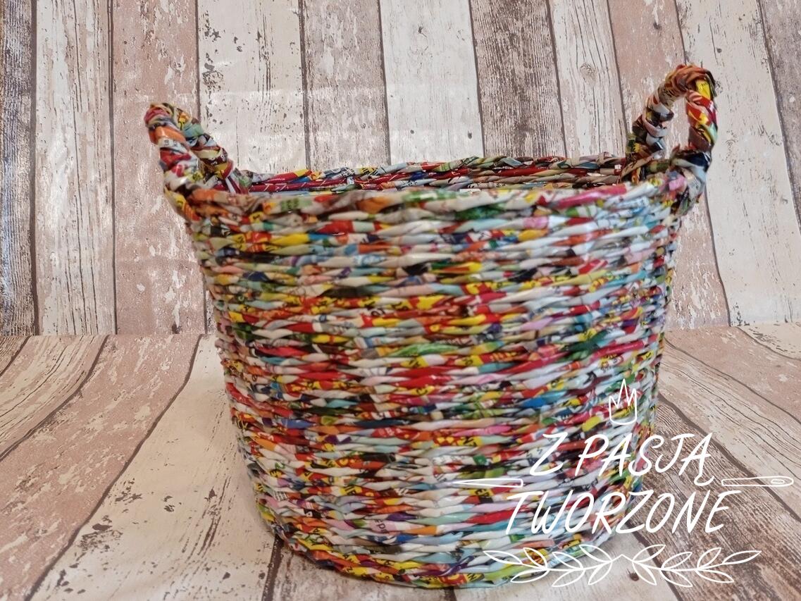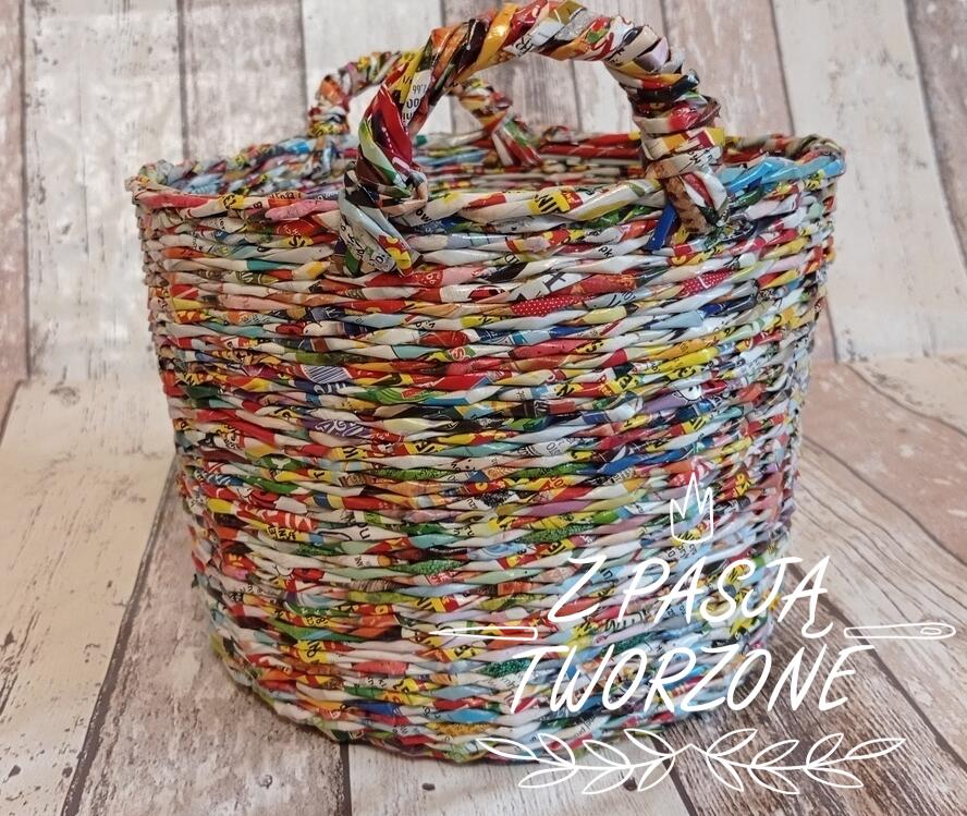 Średni koszyk wykonany z ulotek . Multicolor. Koszyczek o szerokości dna 20,5 cm i 24,5 cm w najszerszym miejscu. Wysokość koszyczka 18 cm, z uszami 22 cm. Koszyczek utrwalony lakierem akrylowym.